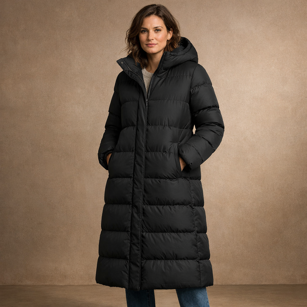 Langer Steppmantel mit Kapuze und Reißverschluss